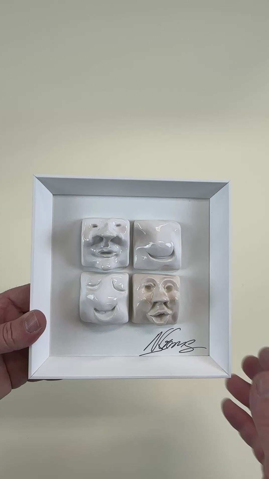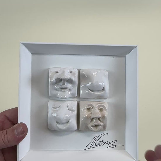 Produto: Quadro decorativo com 4 rostos modelados em cerâmica à mão